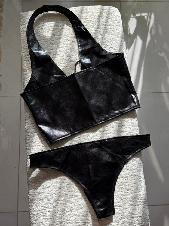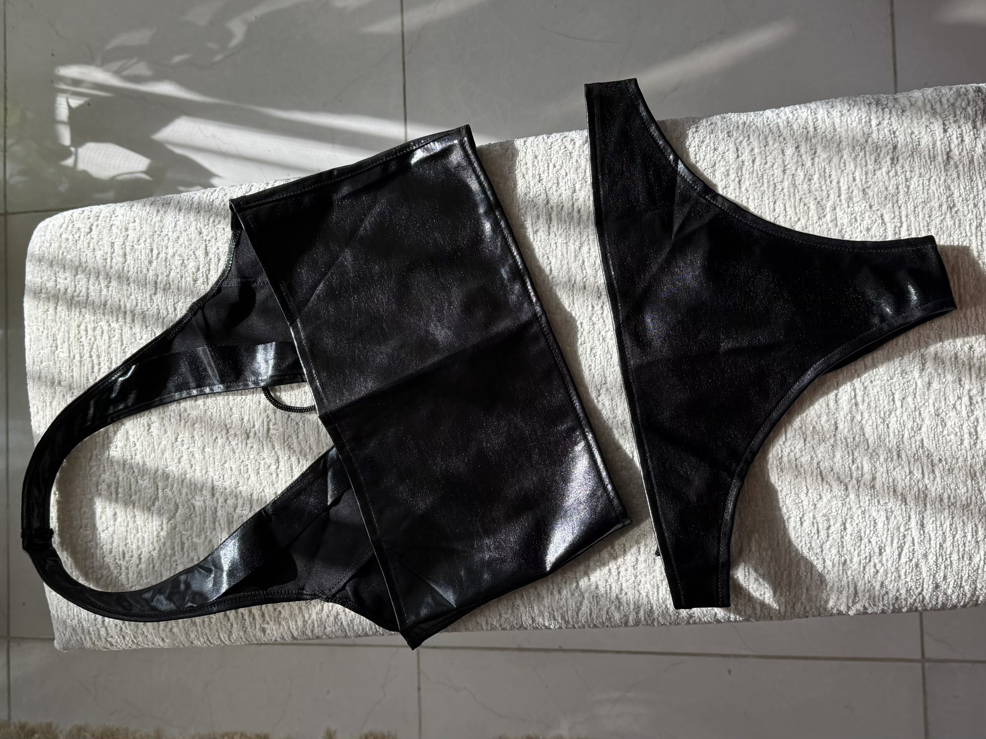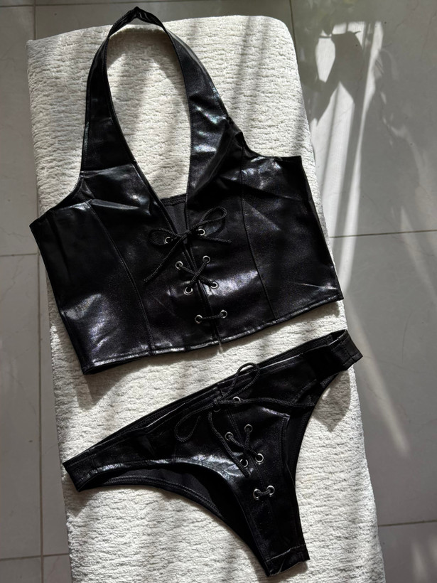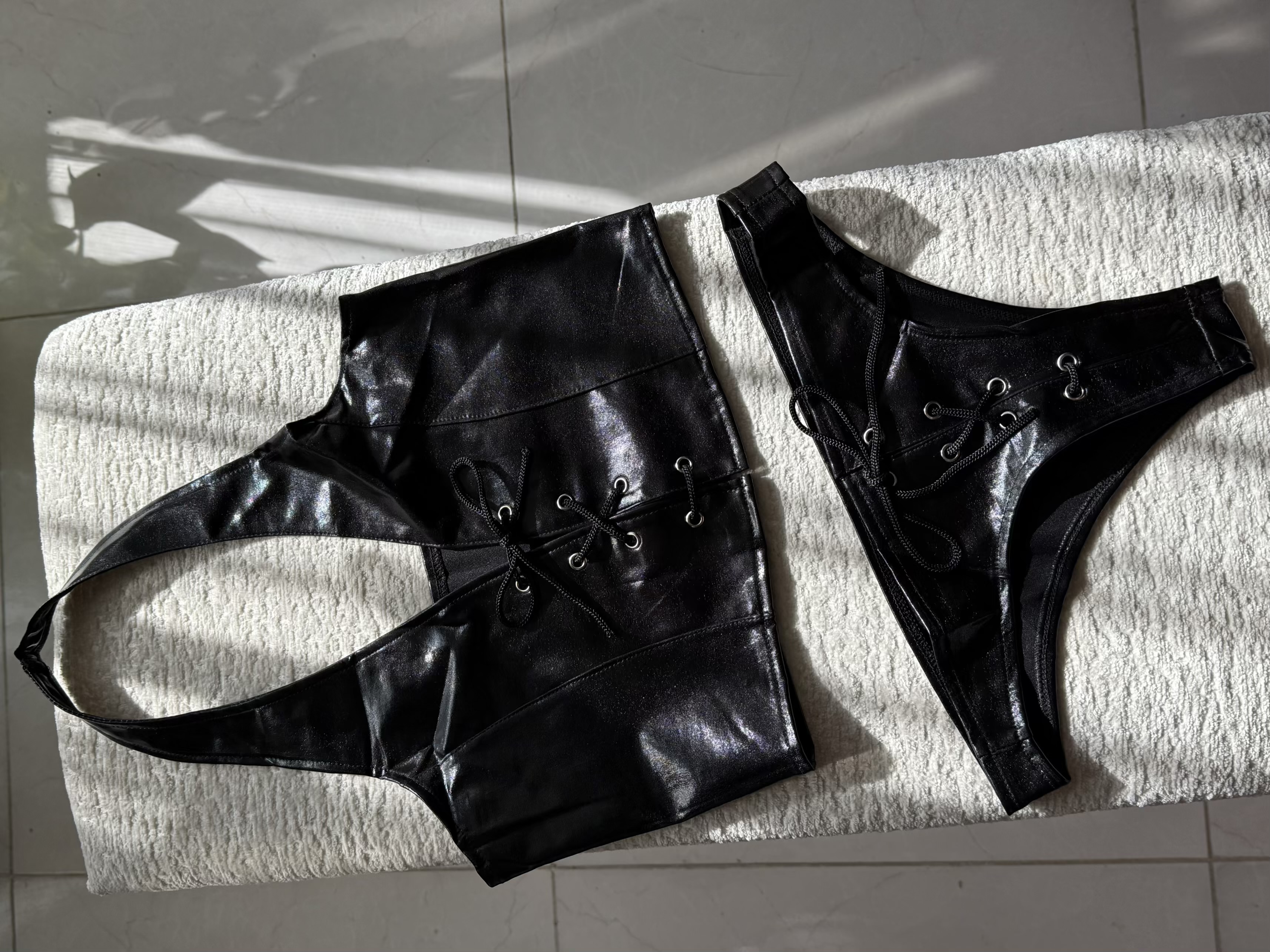 ست لاتکس وارداتی، شامل تاپ هالتر و شورت، دوخت تمیز، جلو بندی (lace-up) و قابل تنظیم. برش ها فرم بدن را برجسته میکنند و ظاهری فیت و مدرن ایجاد مینمایند. مناسب برای مواقع خاص و استایل های جسورانه — کیفیت مواد و جزئیات دوخت وارداتی تضمین شده است.