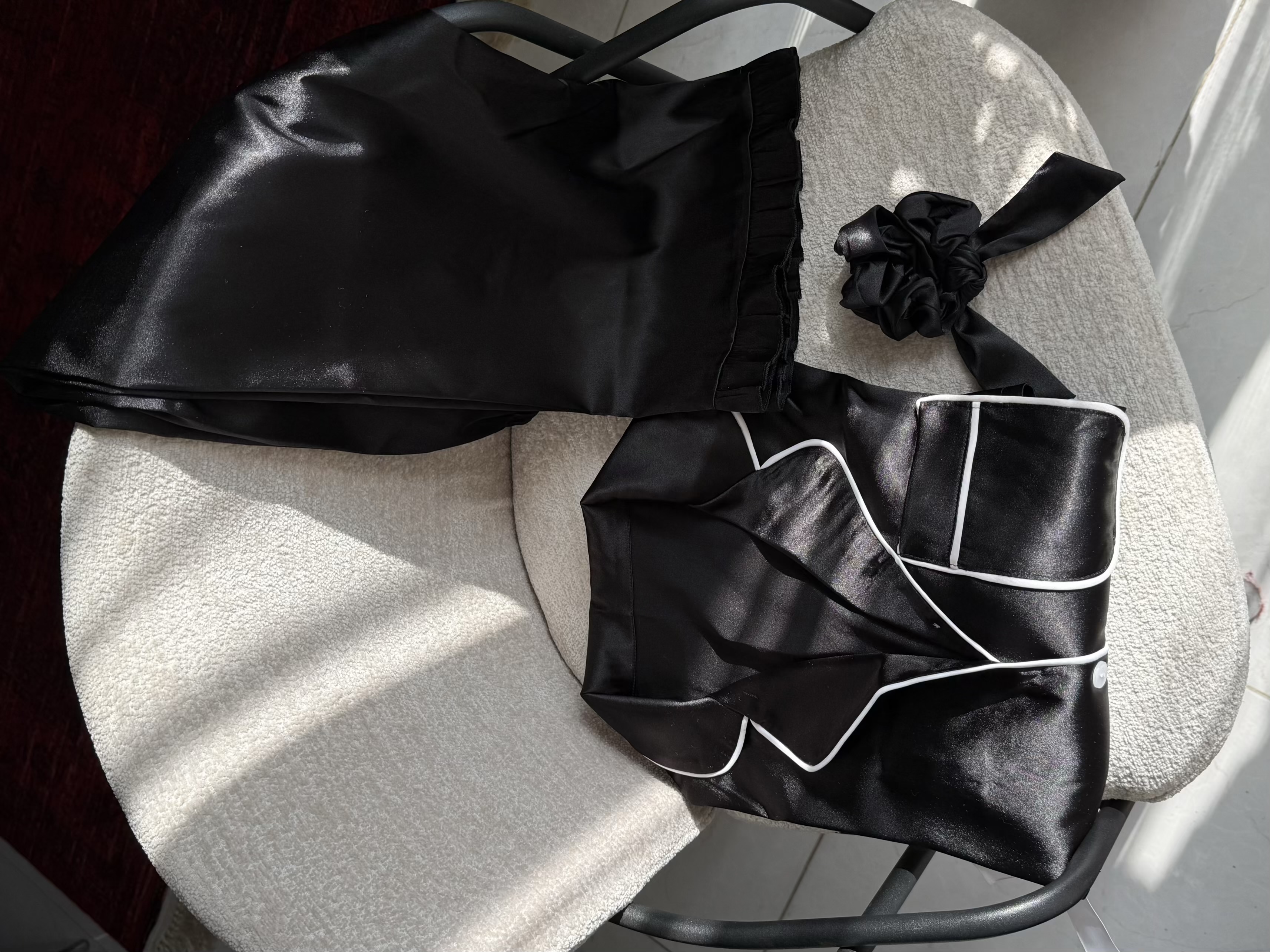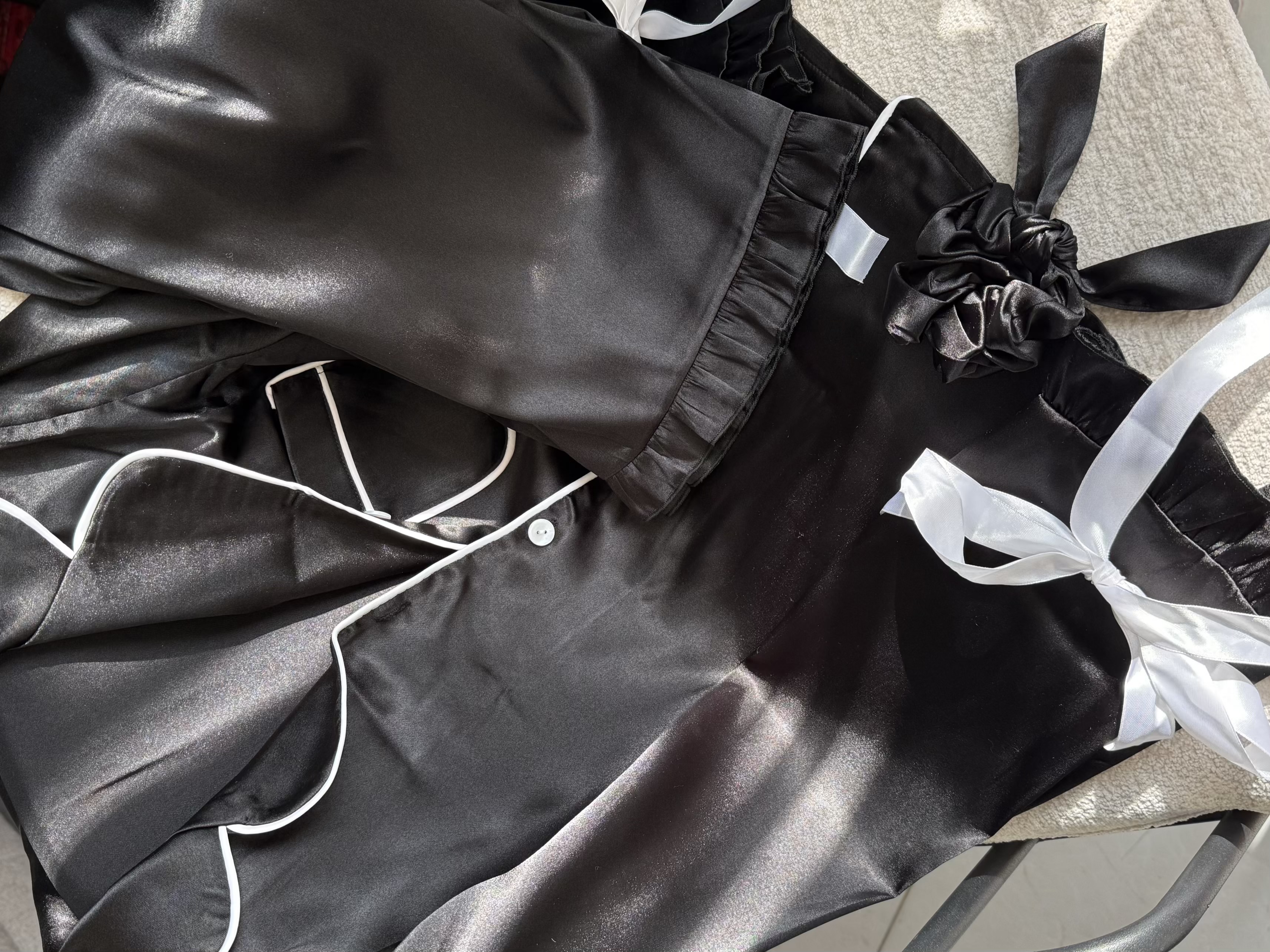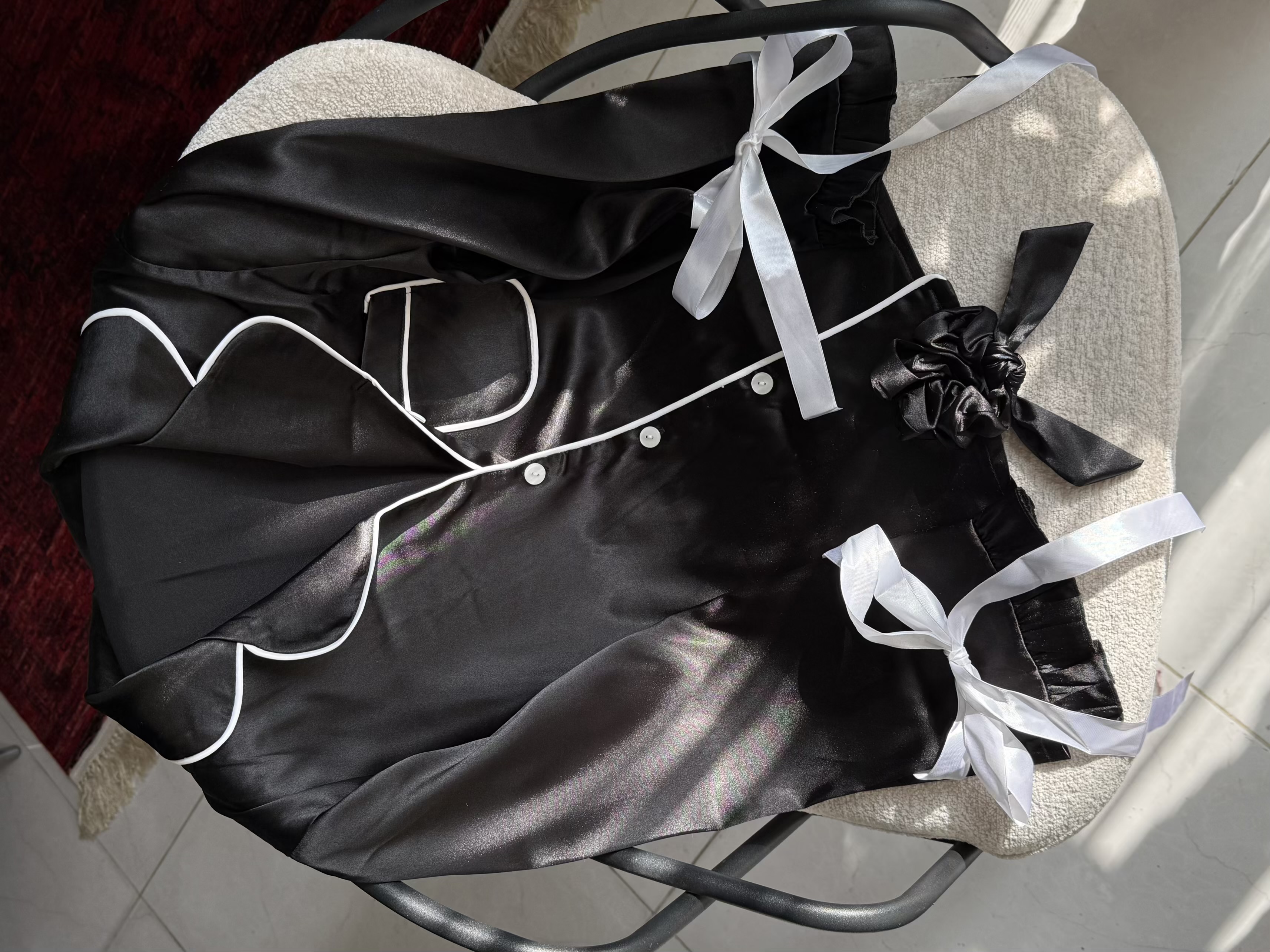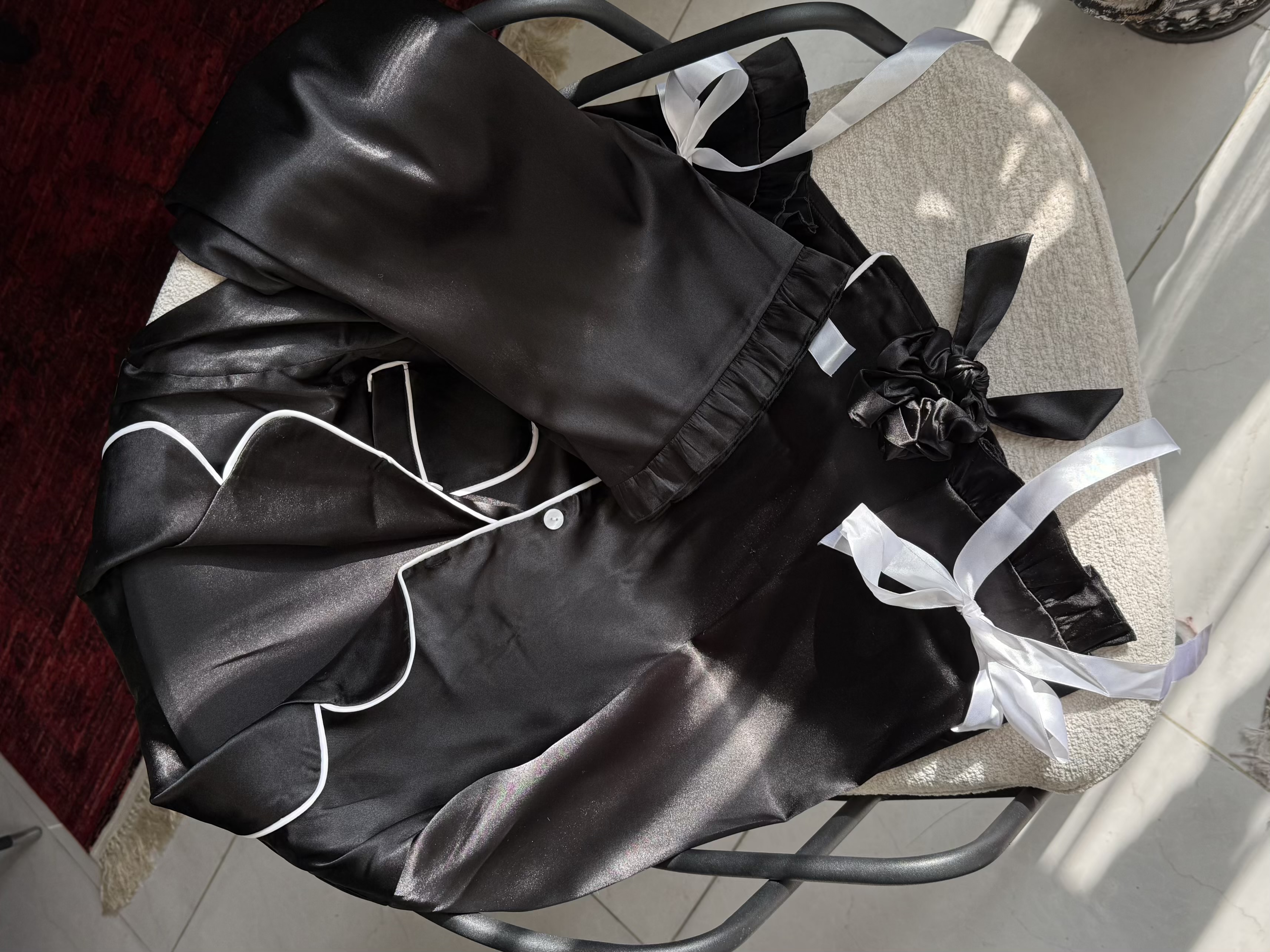 این ست وارداتی از پارچه ساتن ابریشم براق و لطیف تهیه شده و ظاهری شیک و زنانه ایجاد میکند. طراحی کلاسیک دکمه ای همراه با لبه دوزی ظریف، استایل آن را کاملاً متفاوت و جذاب کرده است. دور آستین و دم پا دارای چین ریز بوده و همراه هر ست یک اسکرانچی (کشموی ست) ارائه میشود.