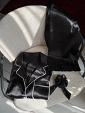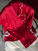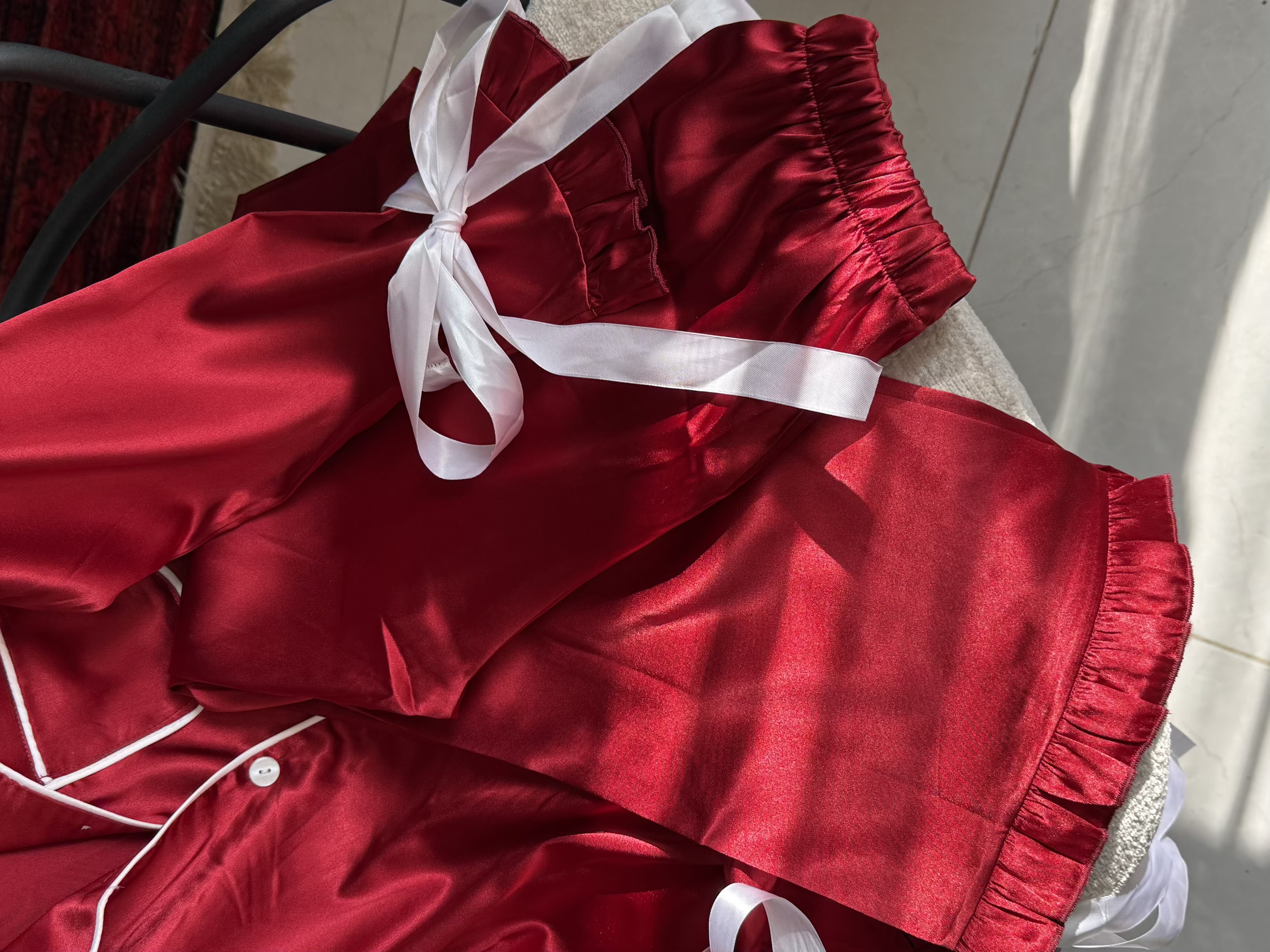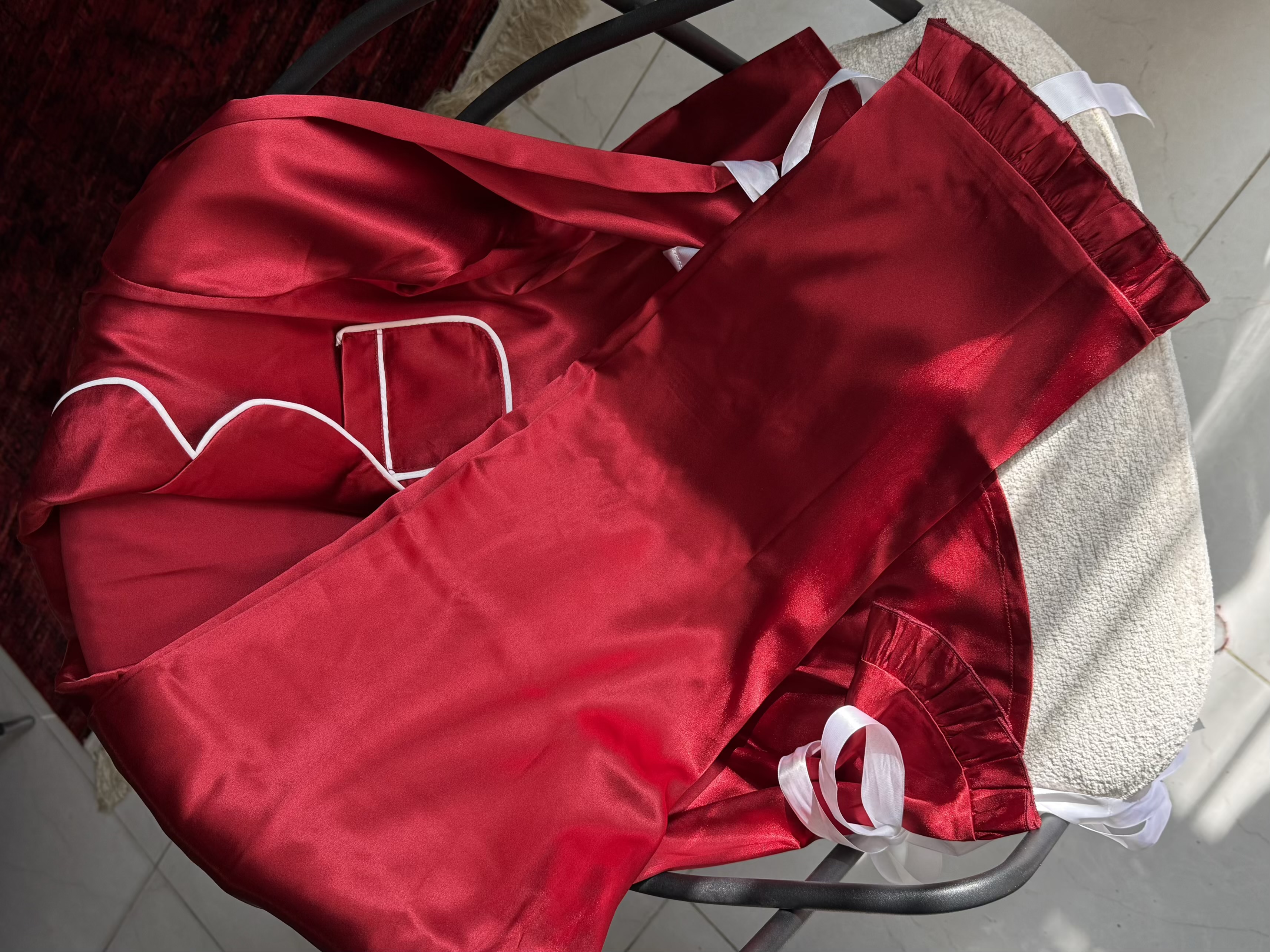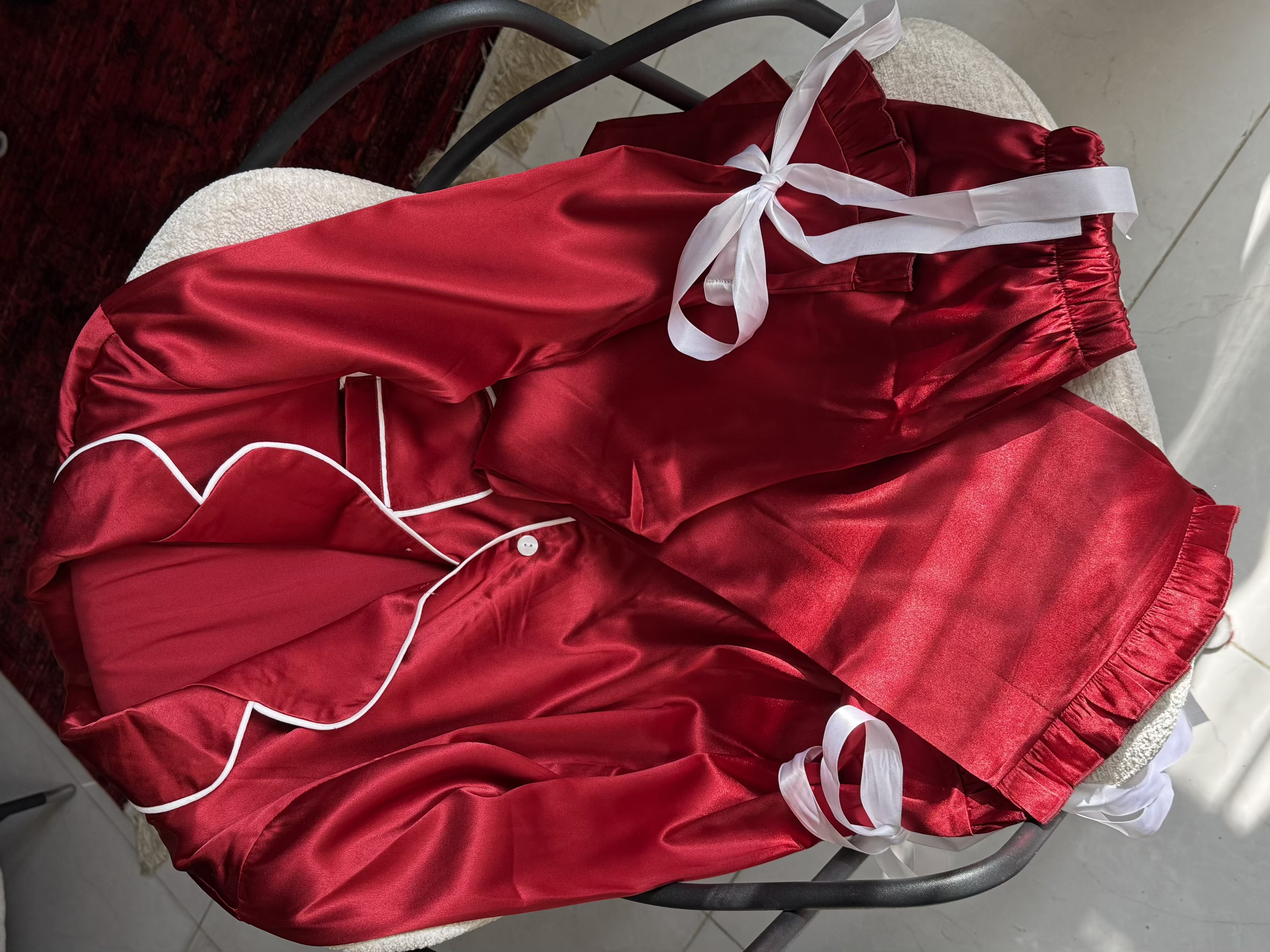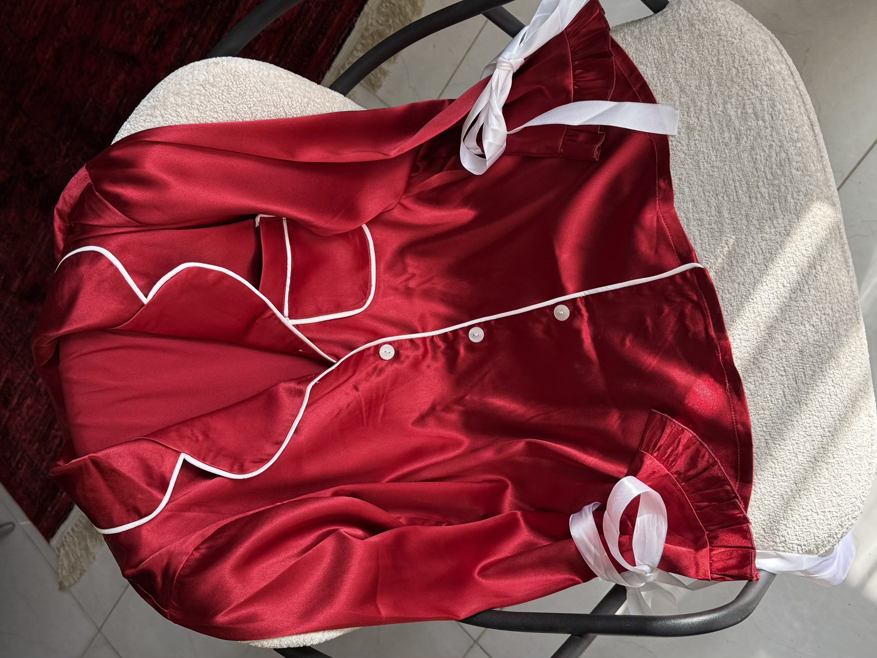 این ست وارداتی از پارچه ساتن ابریشم براق و لطیف تهیه شده و ظاهری شیک و زنانه ایجاد میکند. طراحی کلاسیک دکمه ای همراه با لبه دوزی ظریف، استایل آن را کاملاً متفاوت و جذاب کرده است. دور آستین و دم پا دارای چین ریز بوده و همراه هر ست یک اسکرانچی (کشموی ست) ارائه میشود.