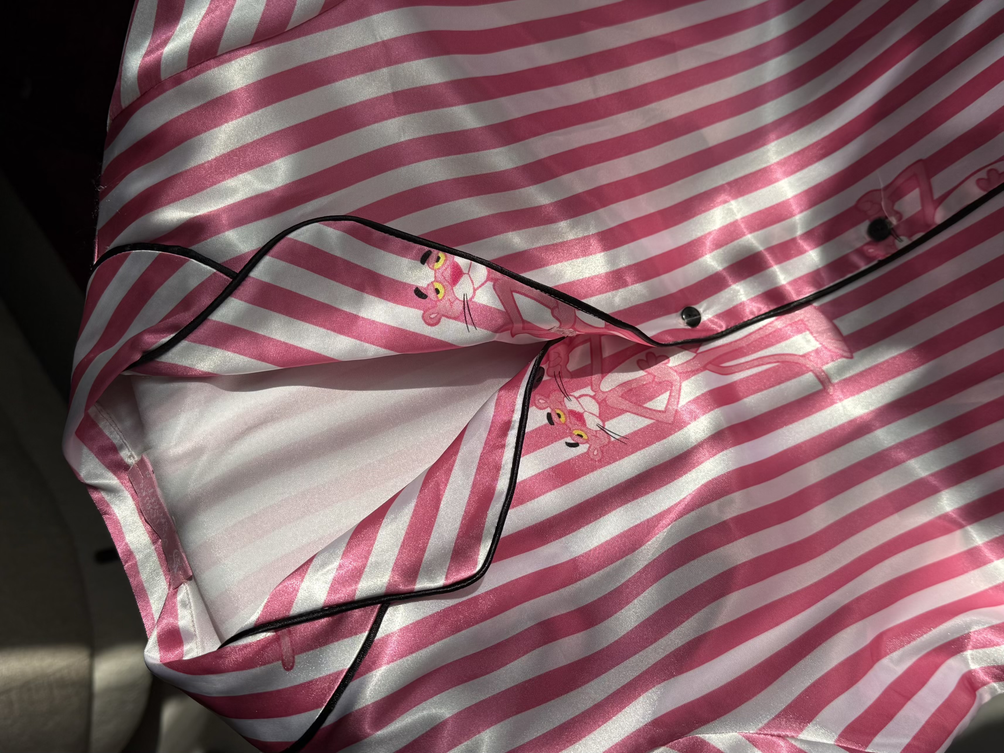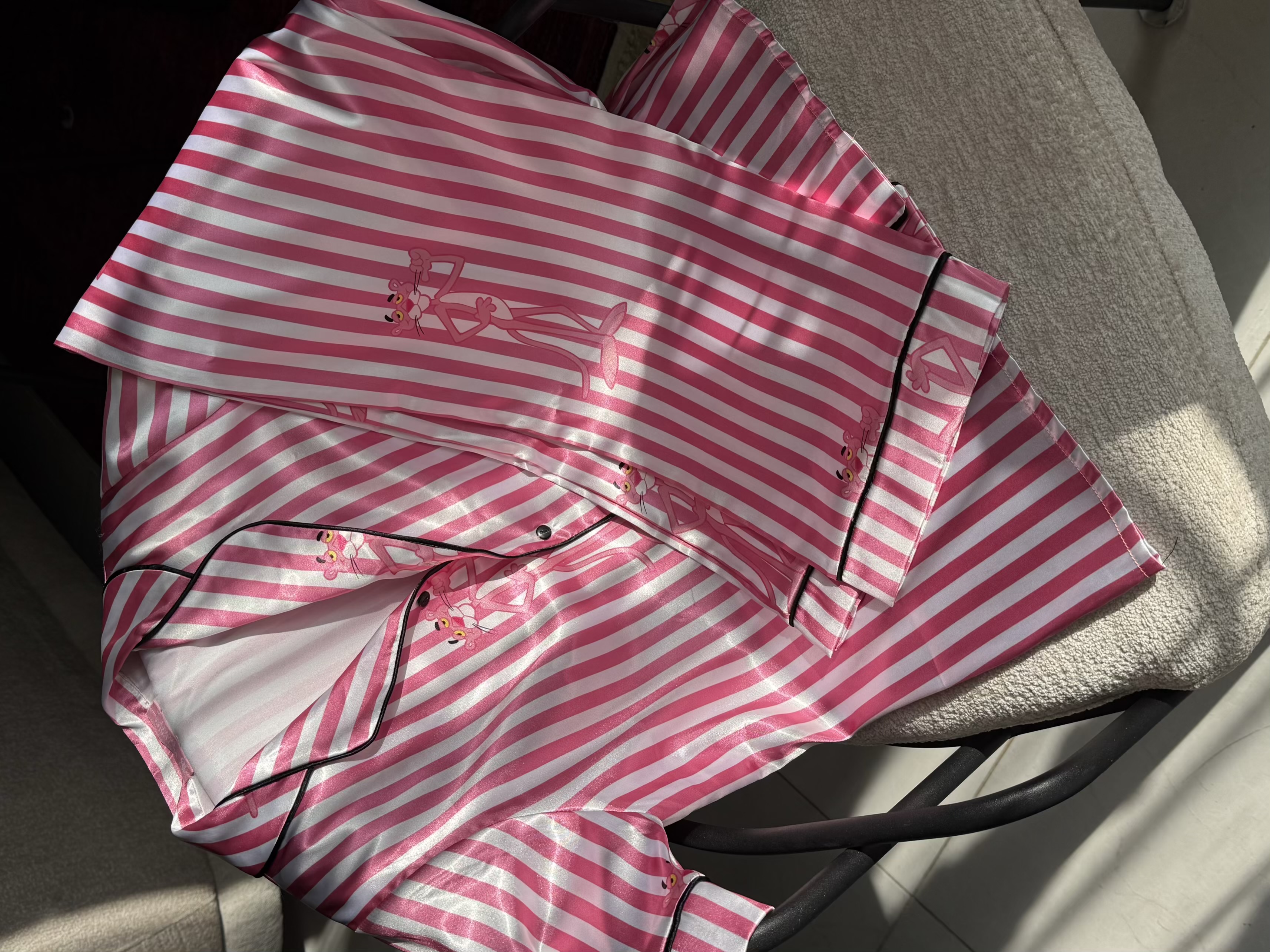 طراحی راه راه صورتی و سفید در کنار جزئیات چاپی پانتر صورتی، ظاهر لباس را به طور خاص دخترانه و فانتزی کرده است. دوخت تمیز، یقه هفت بههمراه نوار مشکی دور کار، و برش آزاد لباس، آن را به گزینهای ایدهآل برای استراحت، خواب یا استفاده روزمره در خانه تبدیل کرده است.