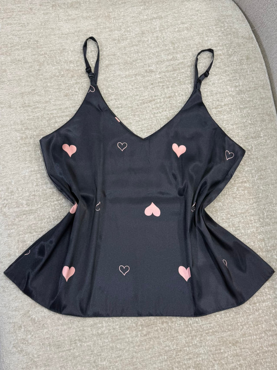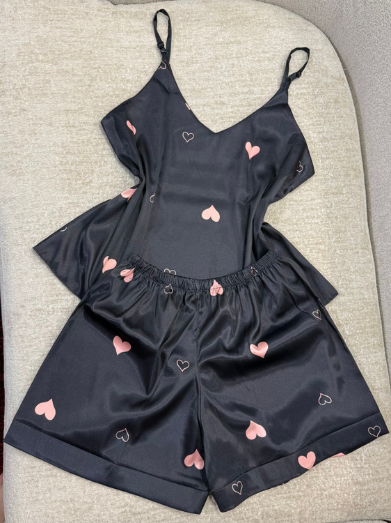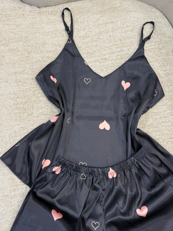 ست تاپ و شلوارک ساتن طرح قلب مشکی