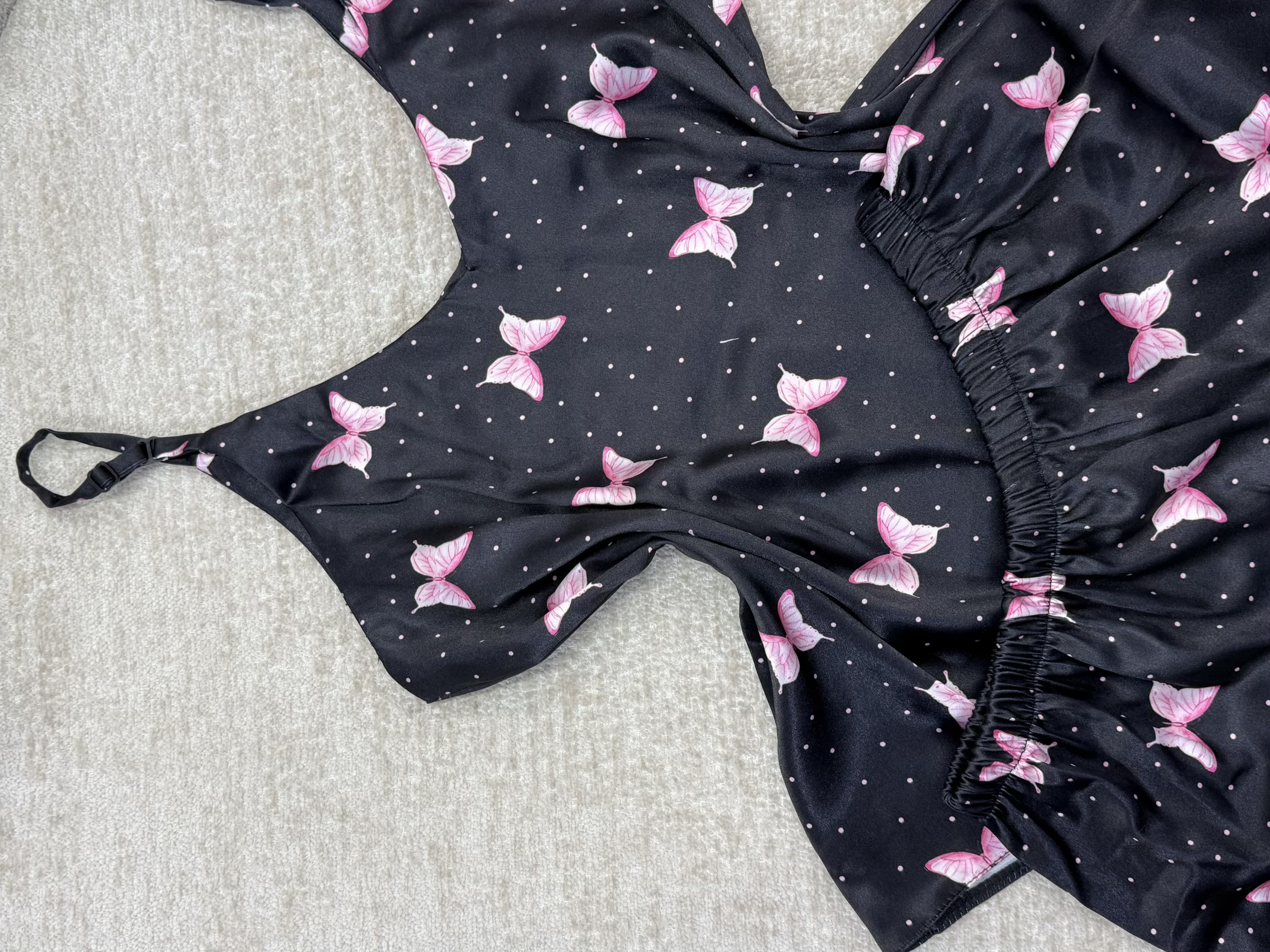 ست تاپ و شلوارک ساتن زنانه طرح پروانه، ترکیبی ظریف و فانتزی از لطافت و استایل شیک است. پارچه ساتن براق و نرم این ست، جلوه ای مرتب و چشم نواز ایجاد میکند و در عین حال حس سبکی و راحتی بالایی روی پوست دارد. طرح پروانه های صورتی روی زمینه تیره همراه با نقاط ریز، ظاهر لباس را دخترانه، لطیف و دلنشین کرده و آن را به انتخابی جذاب برای لباس راحتی و خواب تبدیل میکند.
