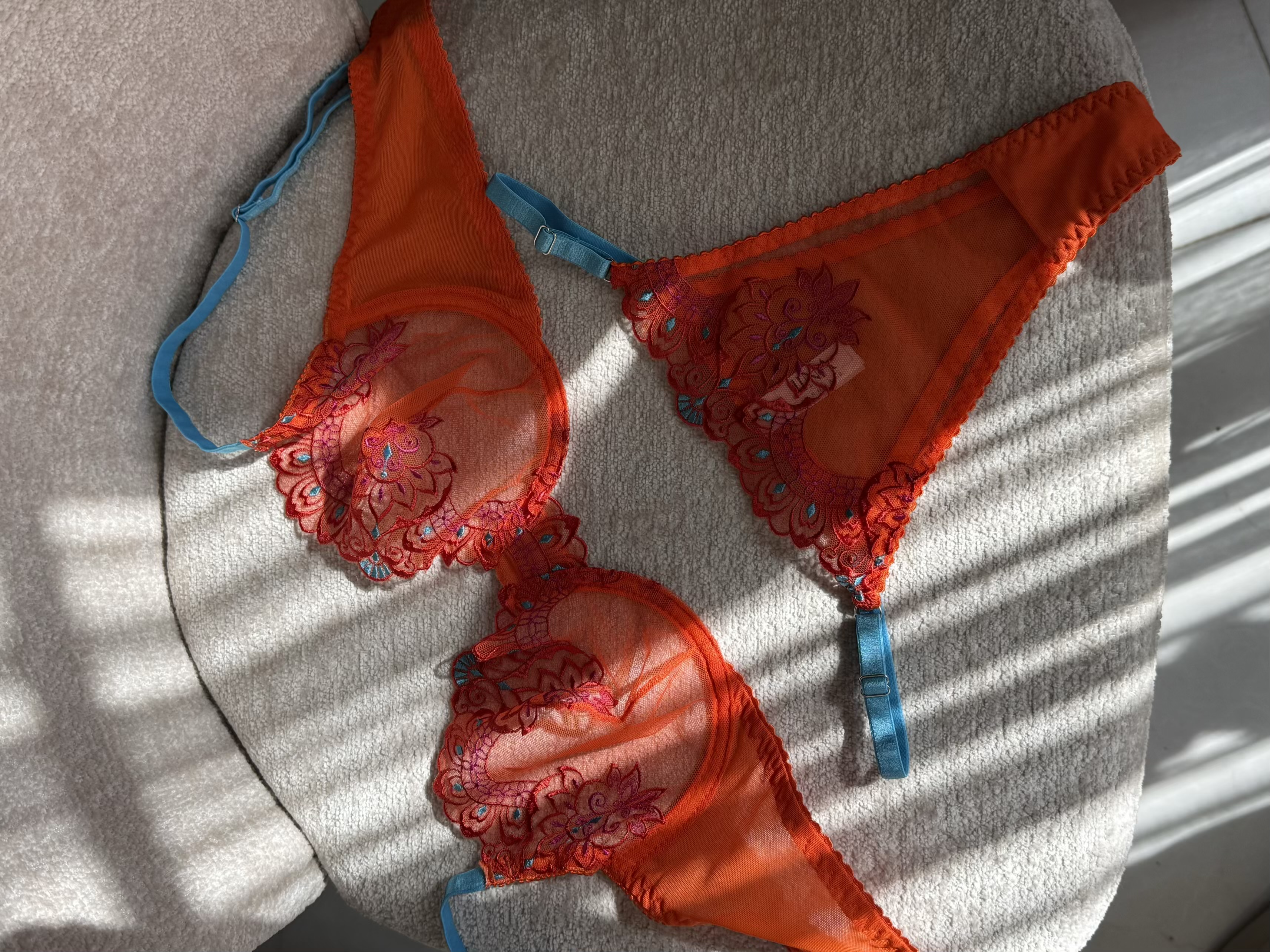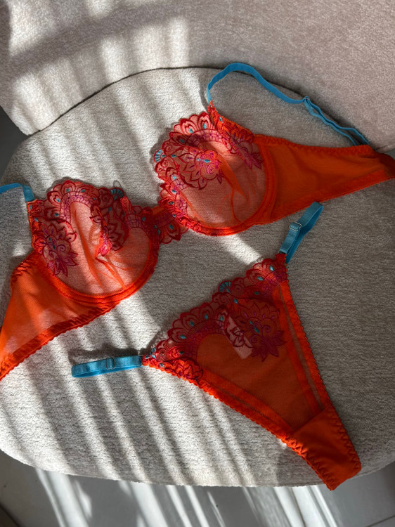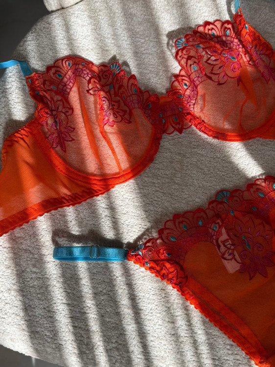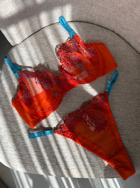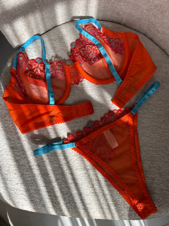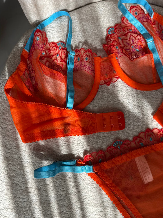 ست سوتین و شورت زنانه لوکس ژینا مدل گلدوزی گل برجسته نارنجی با بند آبی