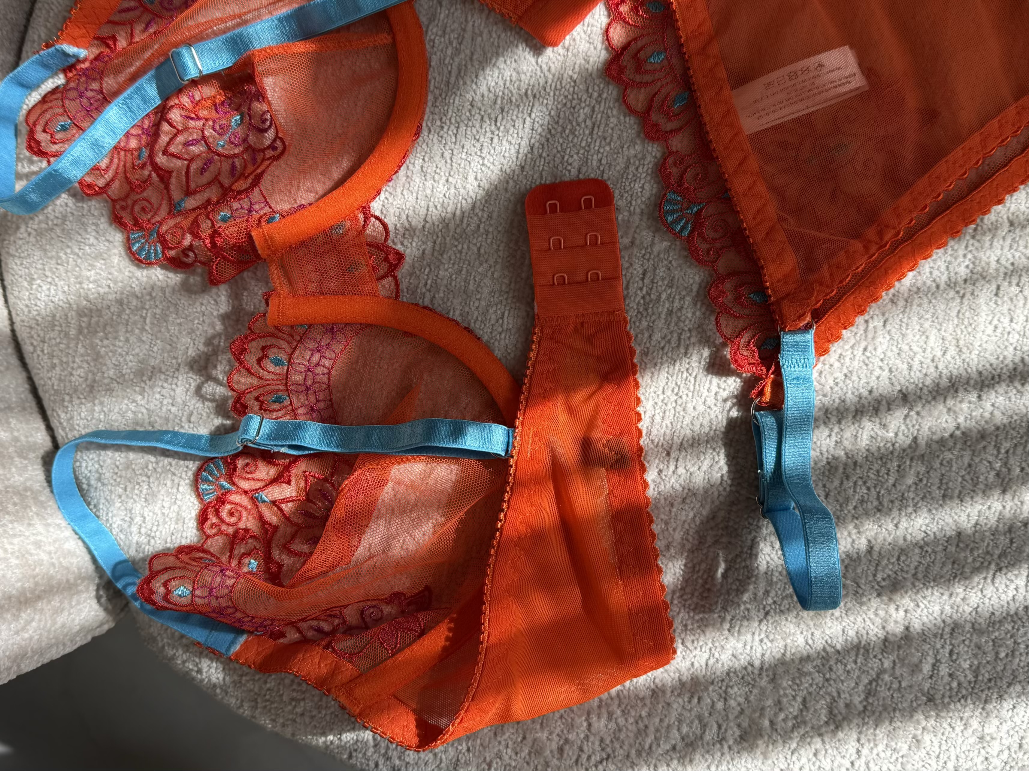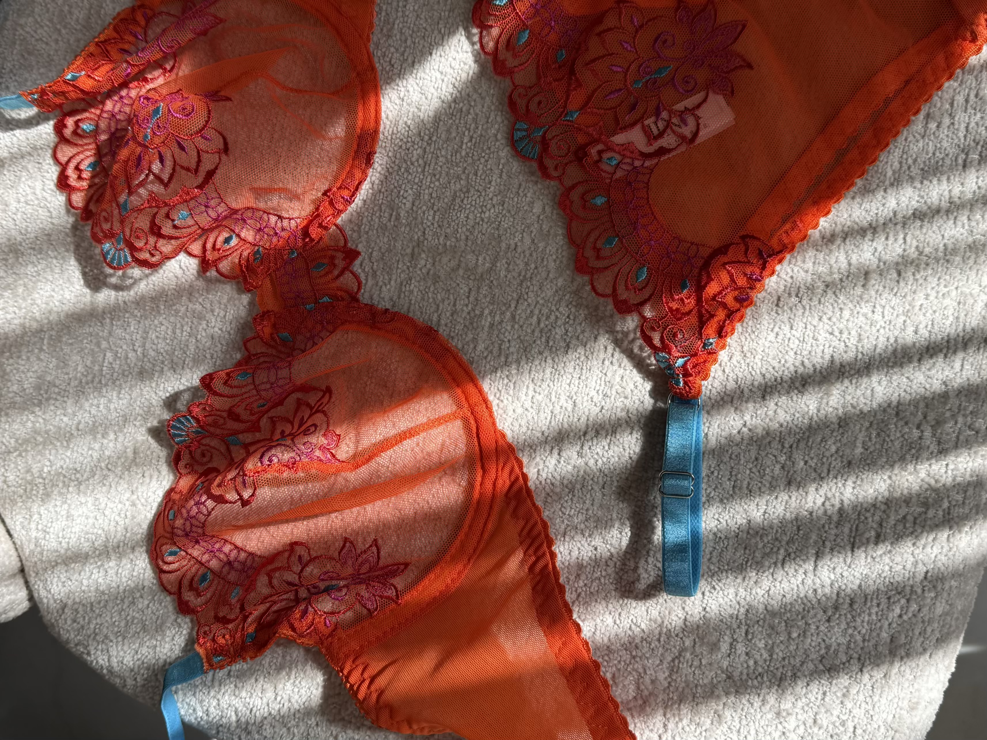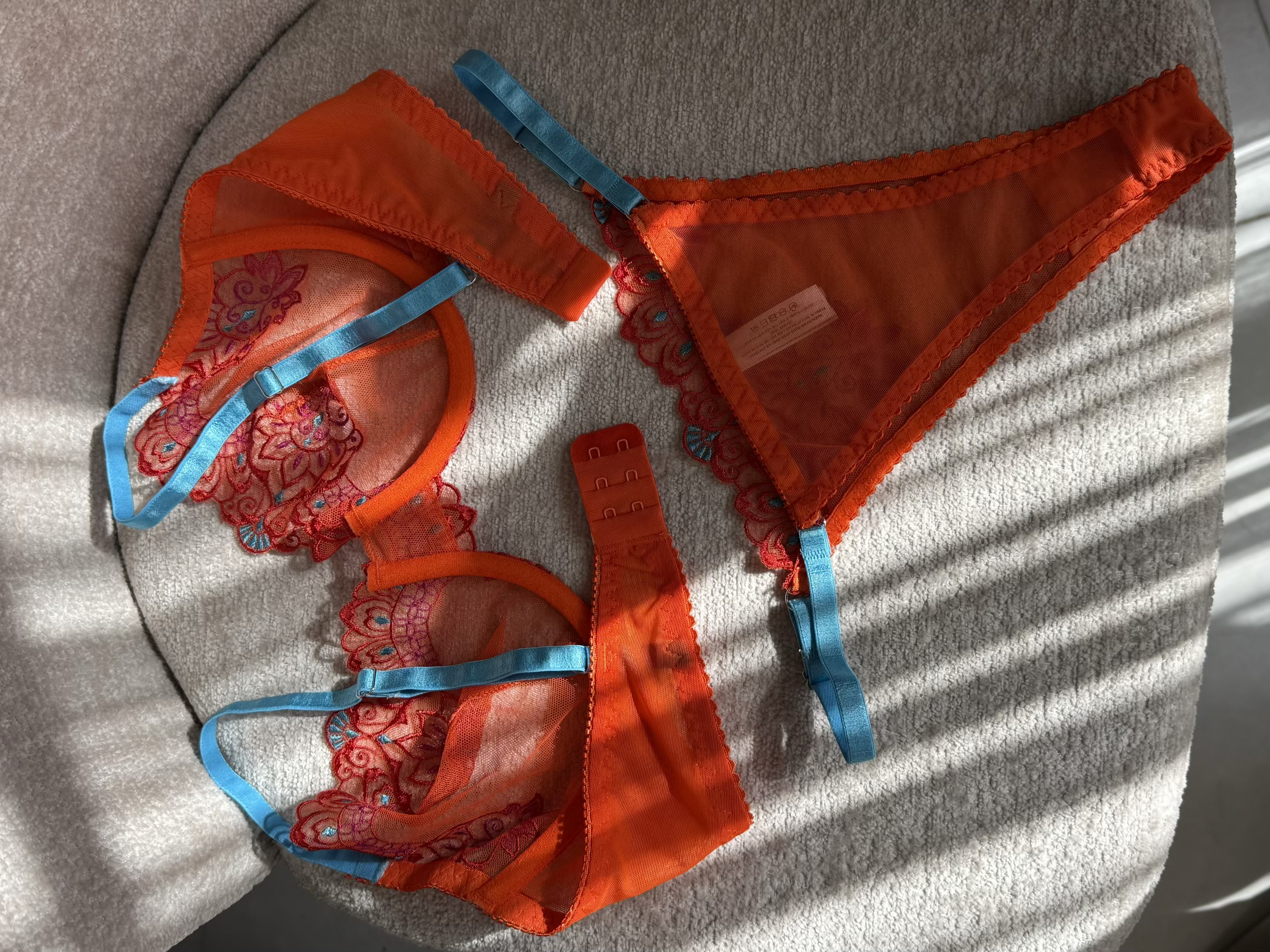 ست سوتین و شورت زنانه لوکس ژینا مدل گلدوزی گل برجسته نارنجی با بند آبی