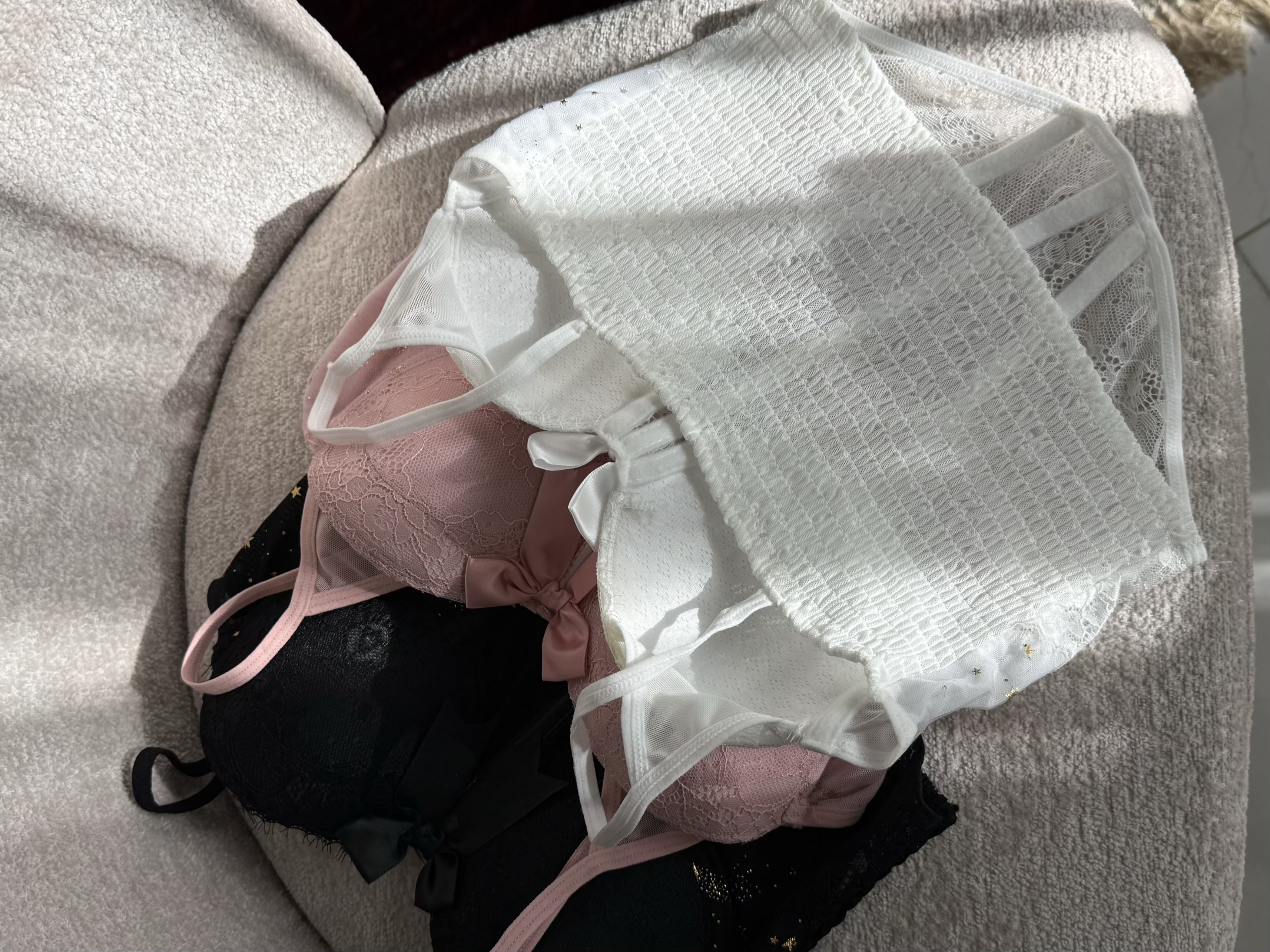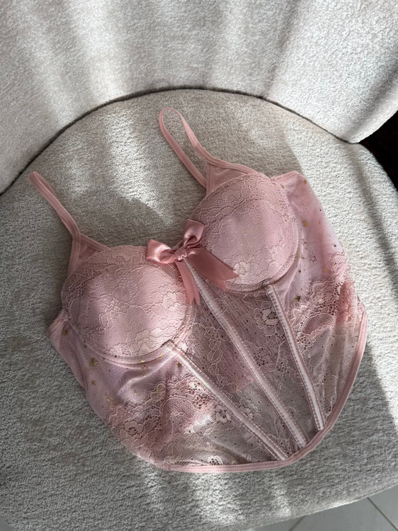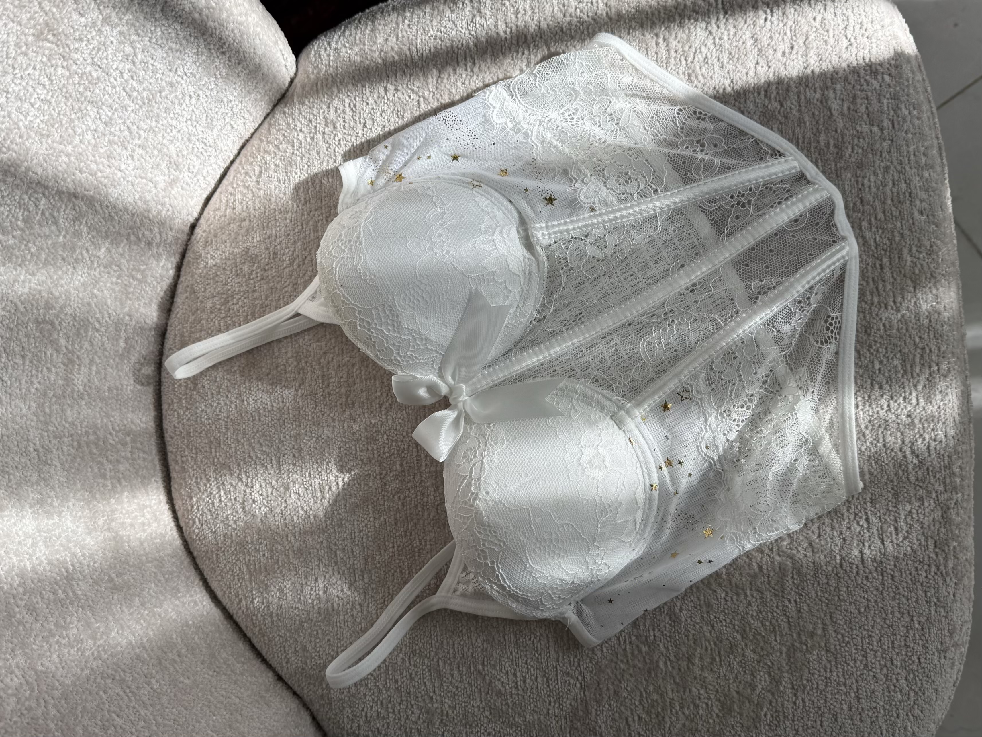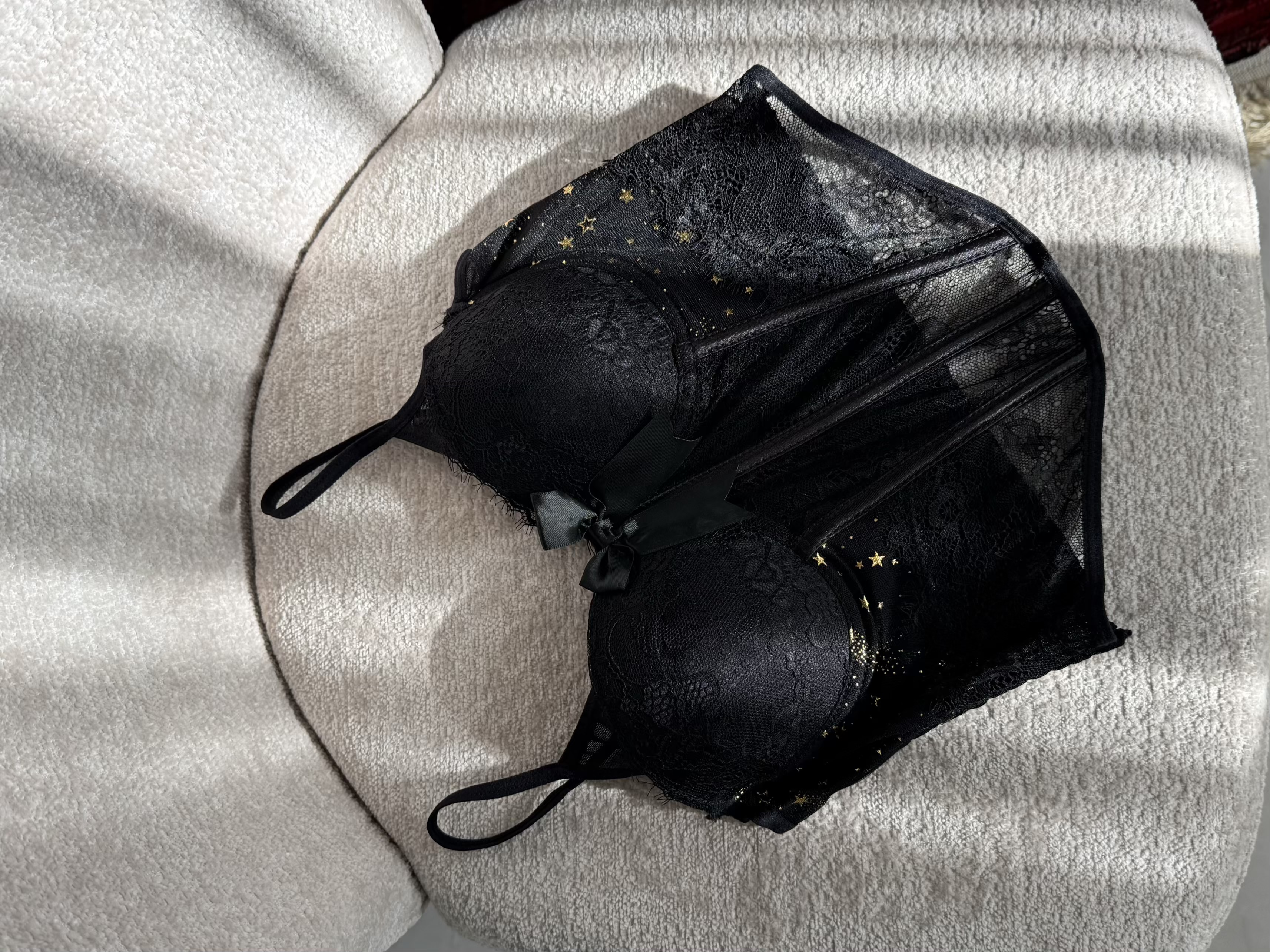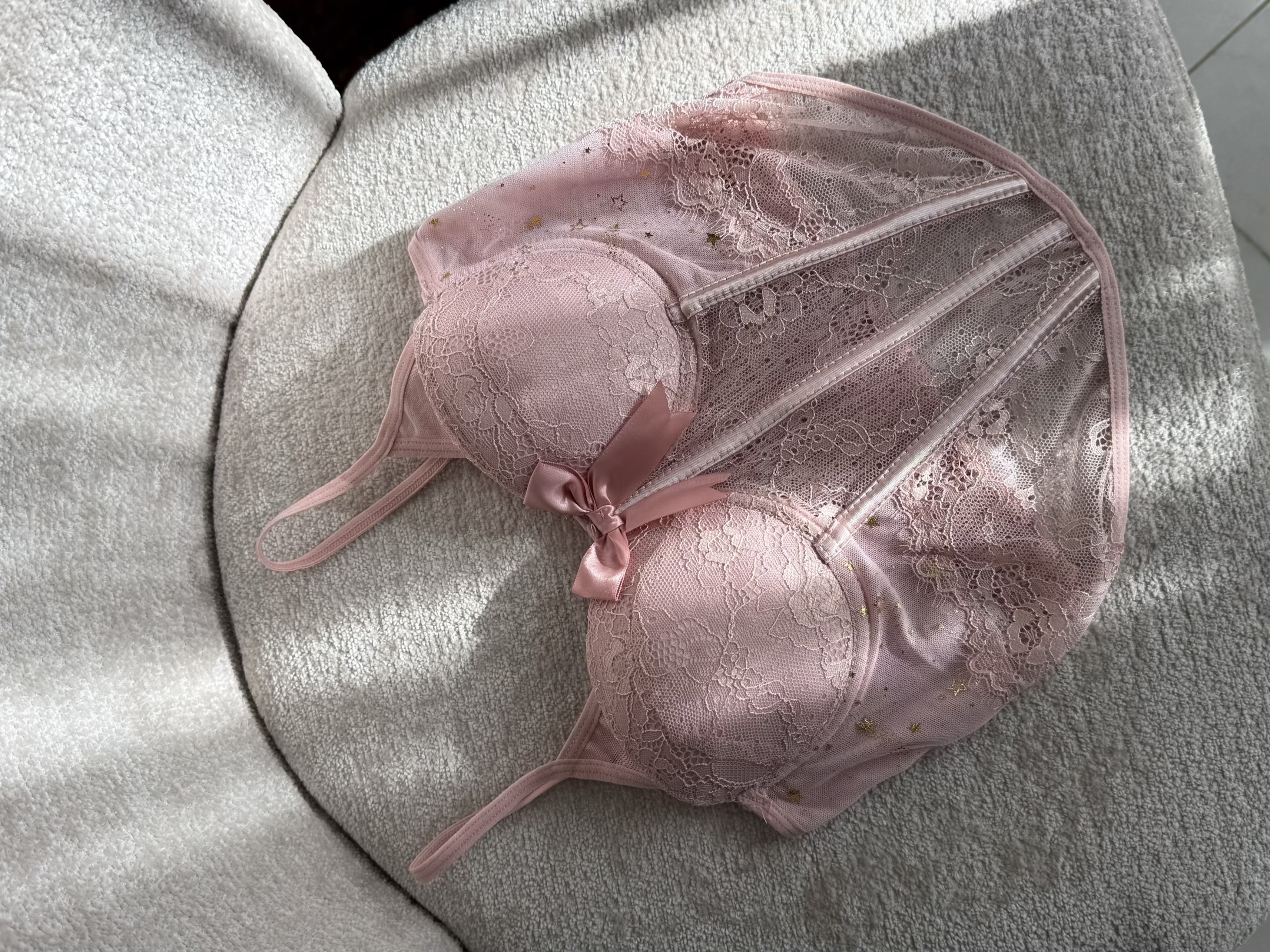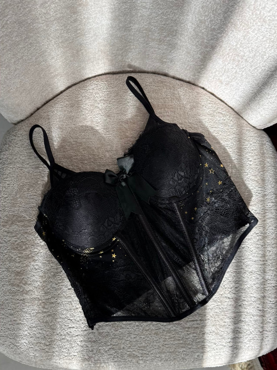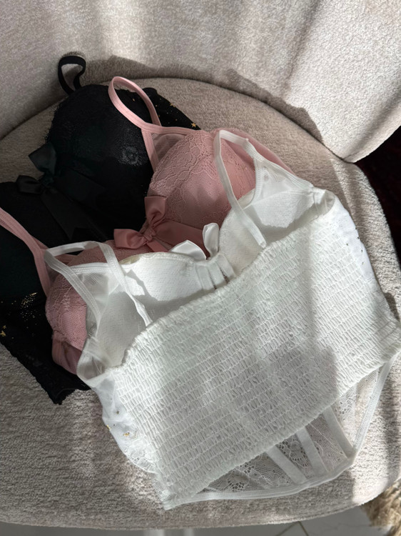 گیپورش خیلی لطیفه و اصلاً اذیت نمی کنه. کاپ هاش فنرداره کاملاً فیت میشه و نیازی به سوتین نیست، که همین خودش یه دنیا راحتیه! خود کار فنردوزی محکم و خوش فرمی داره که کار رو روی تن فیکس و جذاب میکنه، قسمت پشت هم پلیسه هست که کشسانی خوبی داره پ به راحتی فیت میشه. اون ستاره های ریز روی پارچه هم واقعاً کار رو خاص کرده.