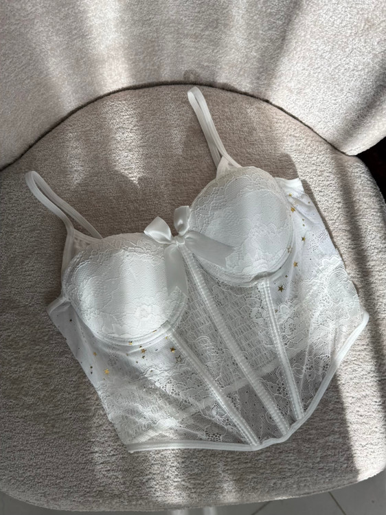 - طراحی خیره کننده: گیپور اعلا با طرح های ظریف، جلوه ای لوکس و دخترانه به این کراپ تاپ بخشیده است. جزئیات ستاره های کوچک درخشان بر روی پارچه، حسی از جادو و خاص بودن را اضافه می کند، قسمت پشت کار پلیسه هست که کشسانی عالی داره و روی تن فیت میشه.