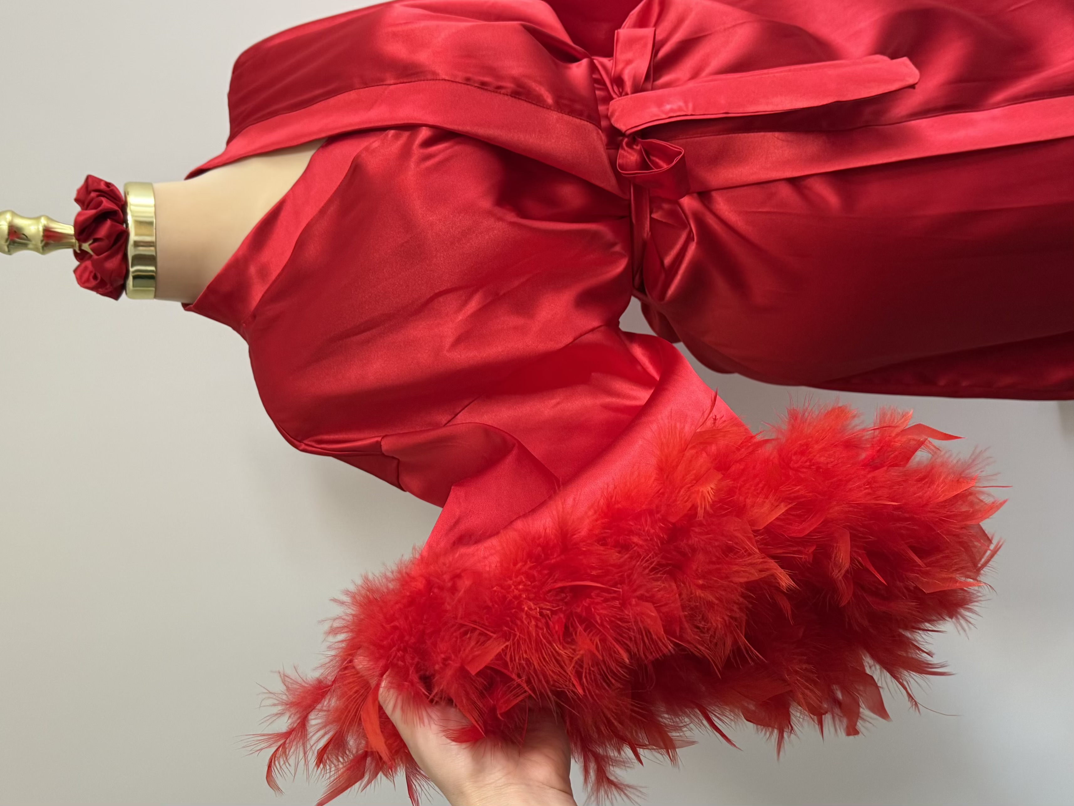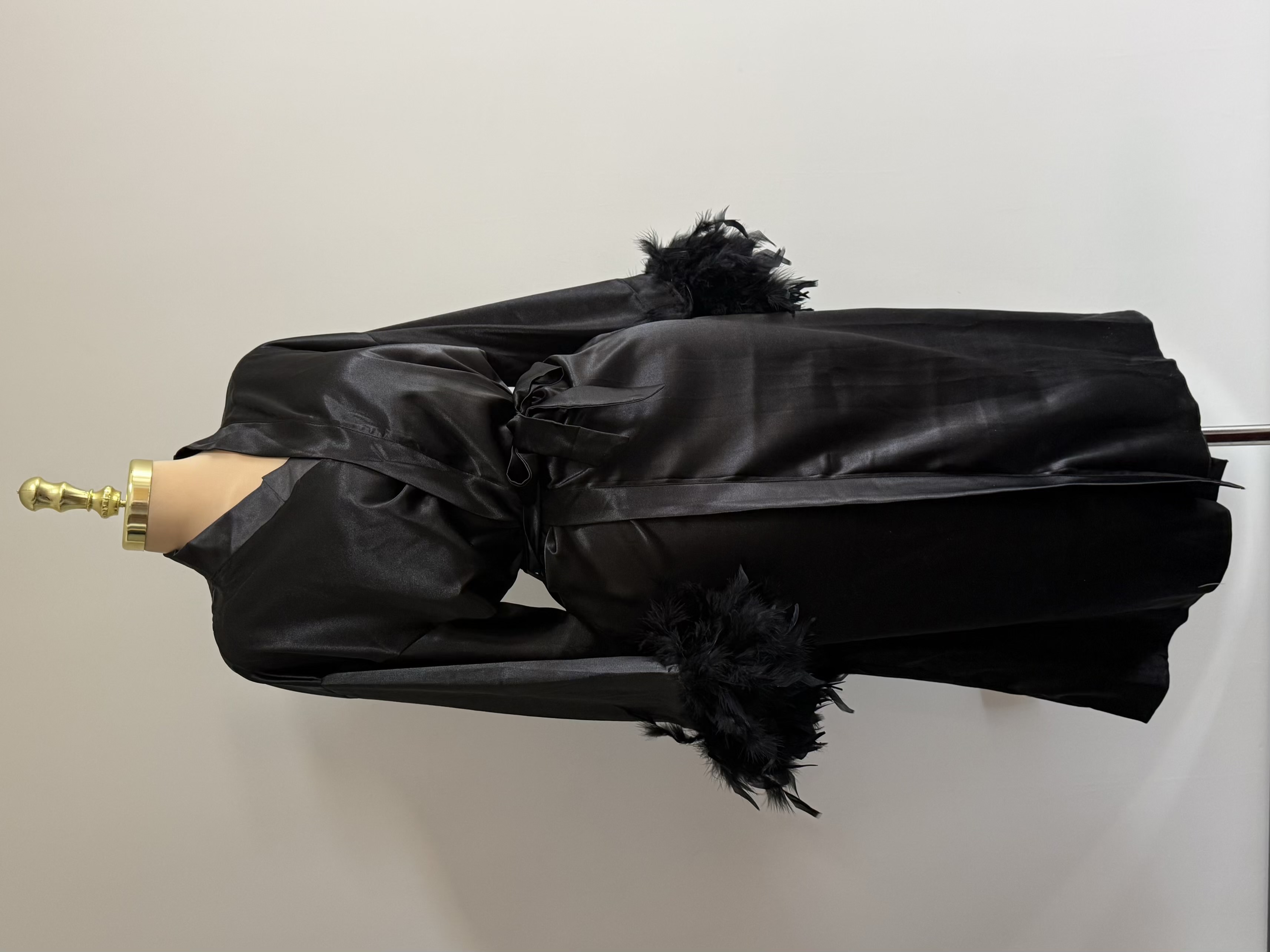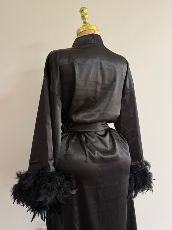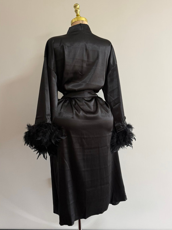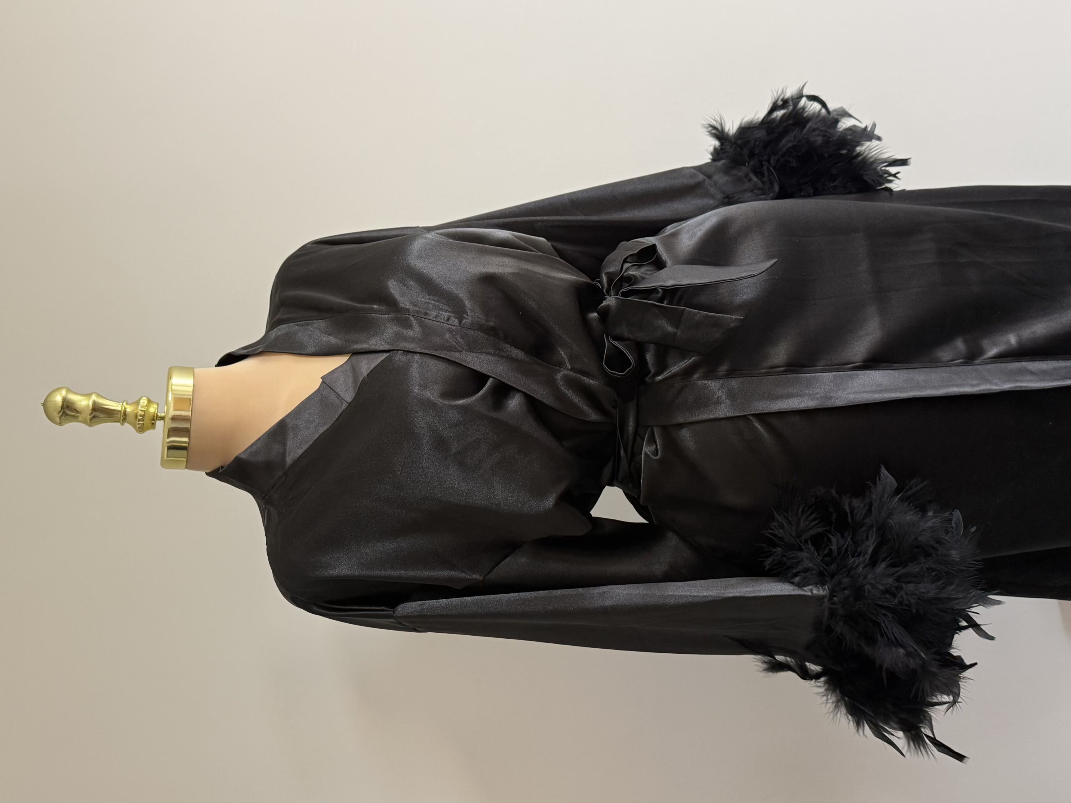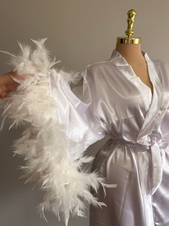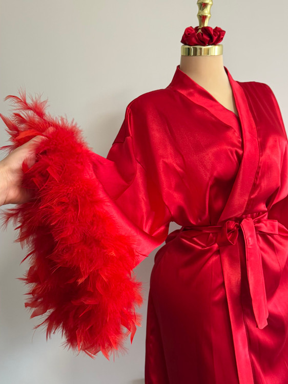 تزئینات پر روی سر آستین، نقطه تمایز این ربدوشامبر است. این پرهای همرنگ پارچه، ظاهری فانتزی و مجلل به لباس بخشیده اند. توجه داشته باشید که پرهای تزئینی با دوخت محکم اتصال یافته اند و احتمال ریزش ندارد.