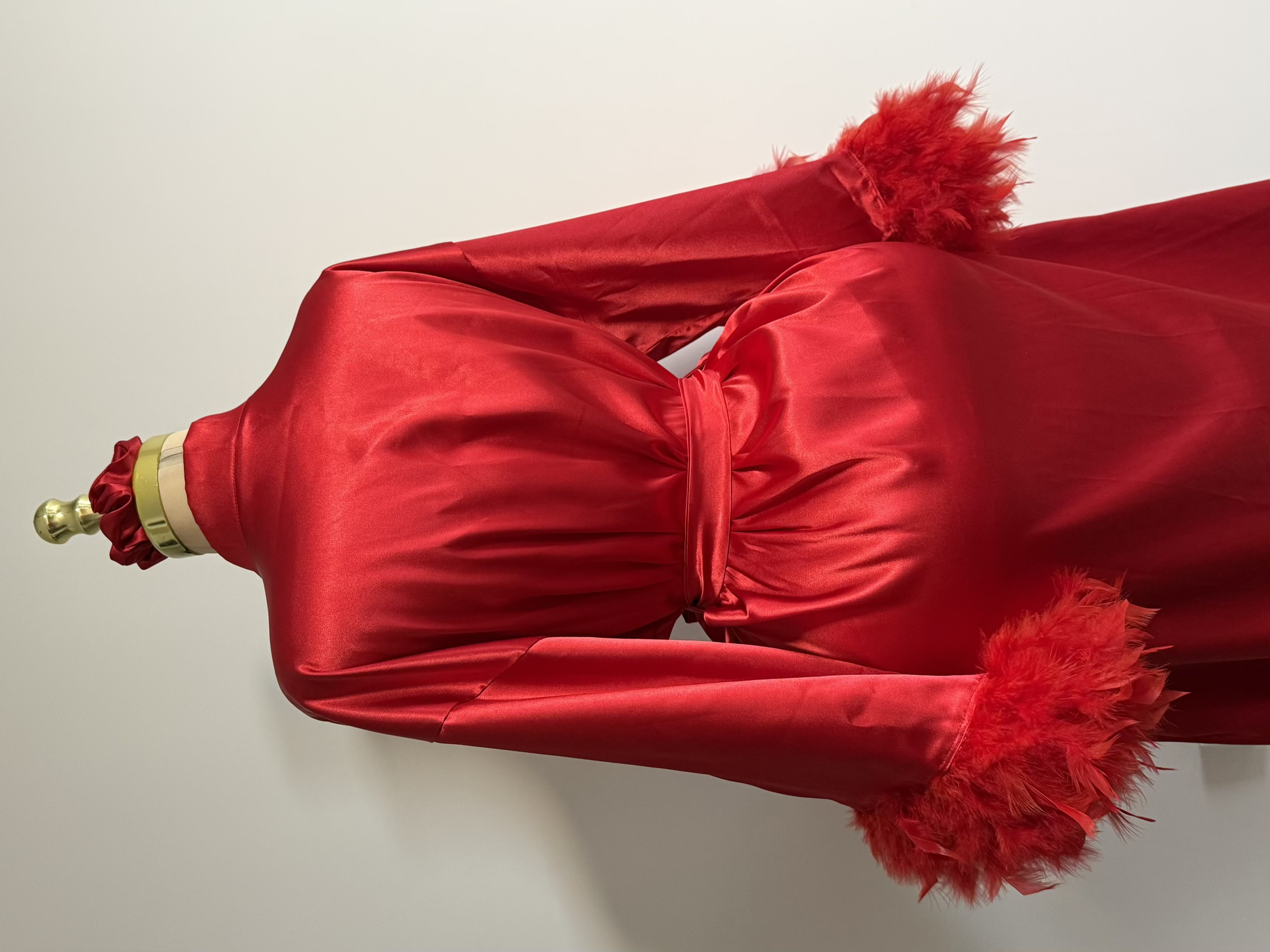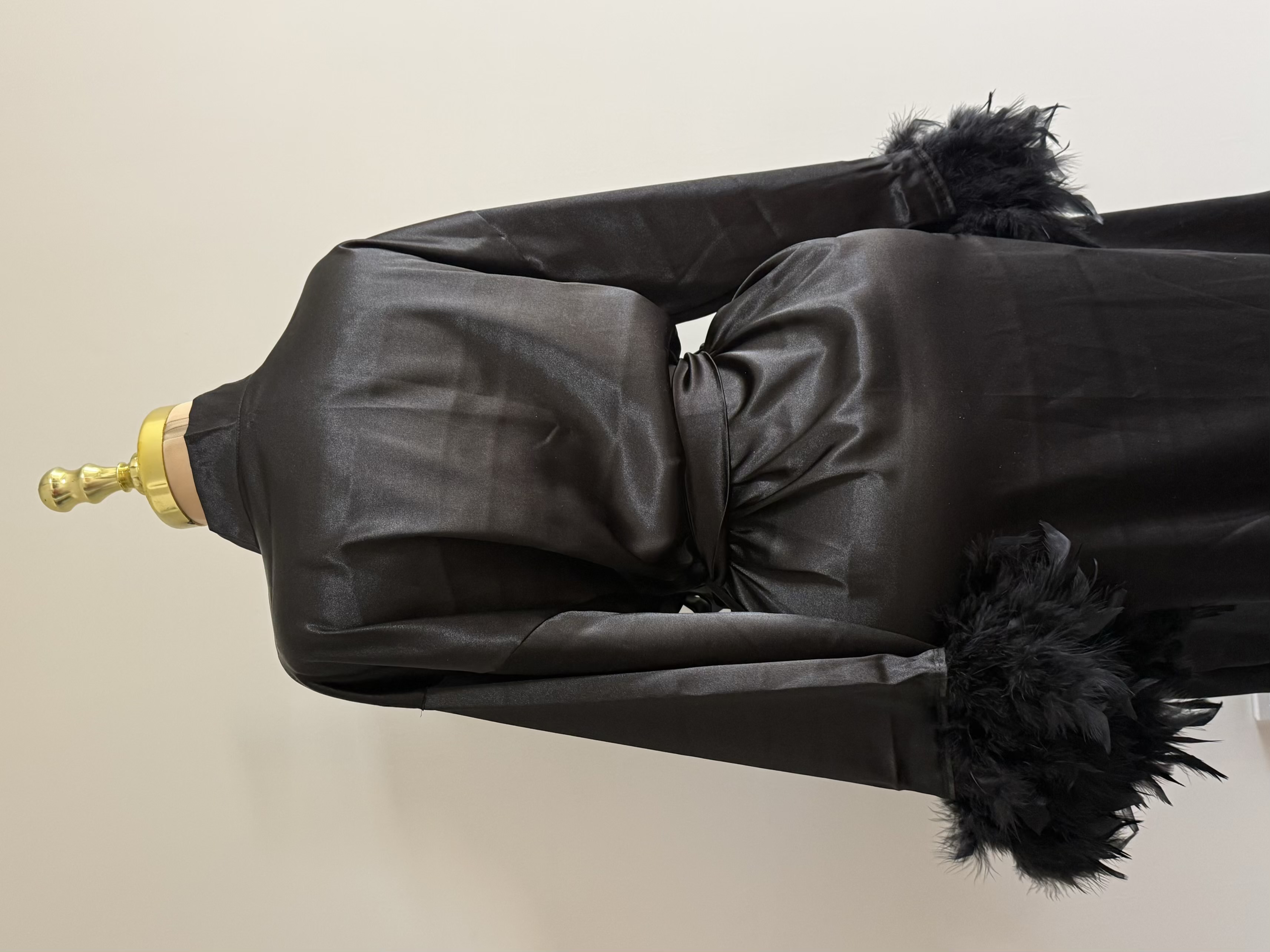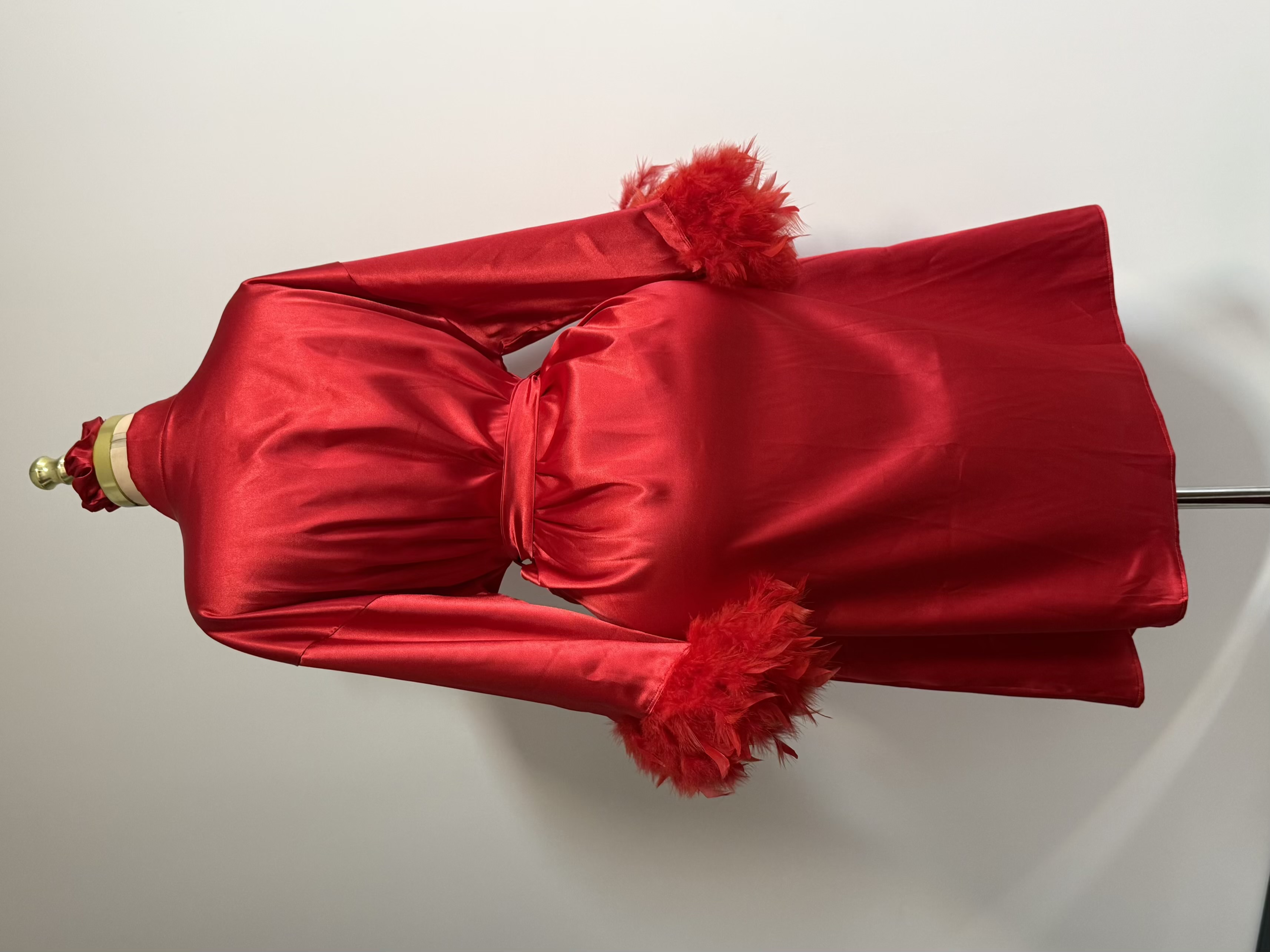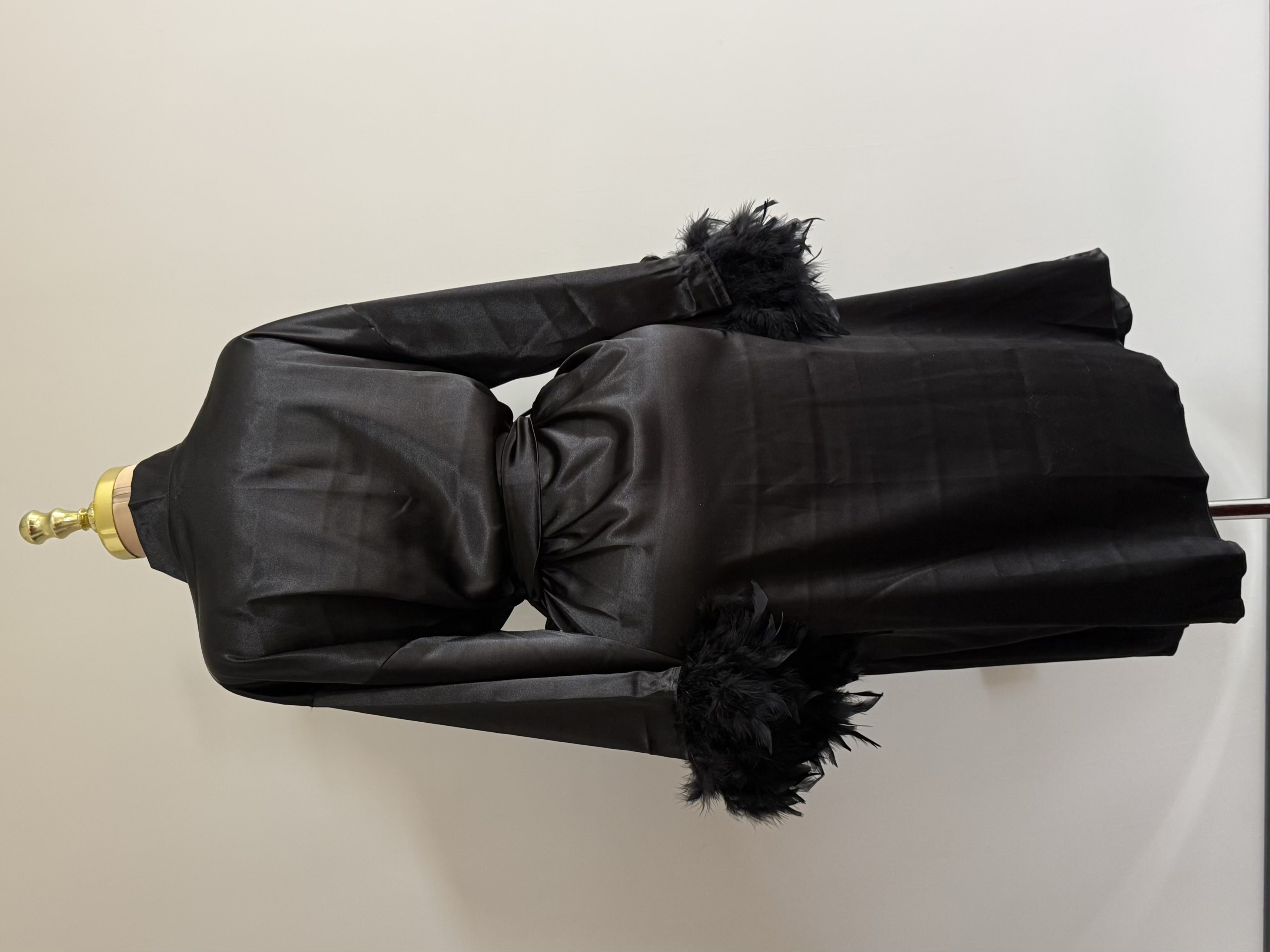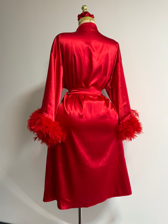 تزئینات پر روی سر آستین، نقطه تمایز این ربدوشامبر است. این پرهای همرنگ پارچه، ظاهری فانتزی و مجلل به لباس بخشیده اند. توجه داشته باشید که پرهای تزئینی با دوخت محکم اتصال یافته اند و احتمال ریزش ندارد.